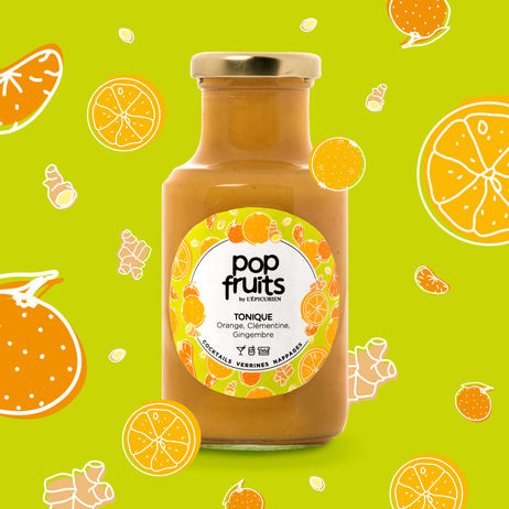 Pop Fruits is a multi use beverage which you can make cocktails, verrines or topping cake with. The explosion of fruits gravitating all around the label shows a fruits mixed beverage which you can play with and try many meal ideas. This is the leitmotiv of the brand L’Épicurien, try, taste, try again, share, create.